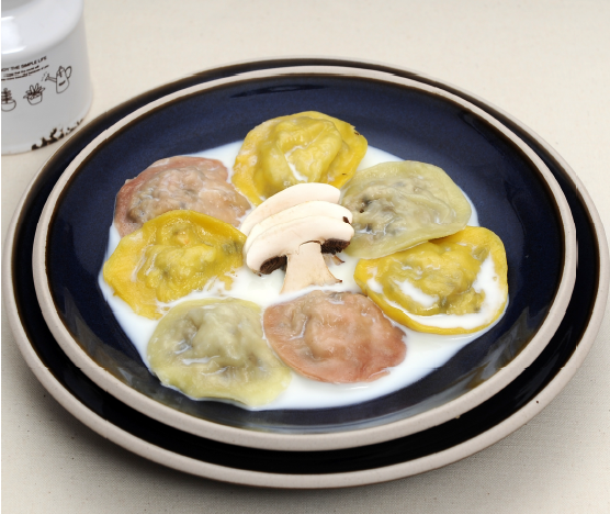 밀가루(100g), 시금치가루(10g), 호박가루(10g) 백년초가루(10g), 물 (40g),식용유(3g), 소금(0.5g) 양파(20g), 양송이버섯(30g), 새송이버섯(20g) 표고버섯(30g), 두부(20g), 소금(0.5g), 새우(20g), 마늘(10g) 우유(200g), 생크림(20g)
