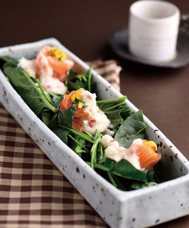 연어 60g, 단호박 50g, 방울토마토 4개, 시금치 50g, 영양부추 50g 소스 : 잣 5g, 더덕 45g, 마늘 5g, 식초 15g, 올리브오일 30g, 다진홍고추 15g