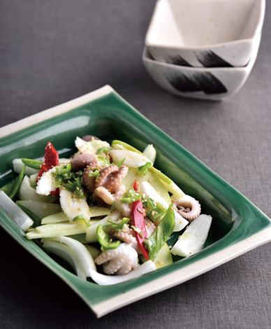 주꾸미 50g, 사과 60g, 더덕 40g, 양파 60g, 청고추 15g, 홍고추 15g 소스 : 마늘기름 30g, 식초 15g, 다진마늘 5g, 다진대파 5g, 레몬소금 1g, 흰후추 1g 다진청고추 15g, 레몬즙 15g