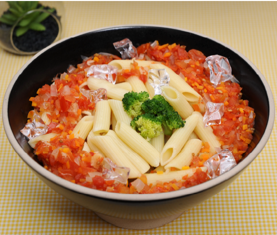 토마토(50g), 브로컬리(20g), 펜네(100g), 올리브오일(10g) 후춧가루(0.1g) - 소스 : 마늘(10g), 양파(20g), 당근(20g), 방울토마토(50g) 올리브오일(10g), 육수(400g), 설탕(10g) 소금(0.3g), 레몬즙(10g), 월계수잎(1장)