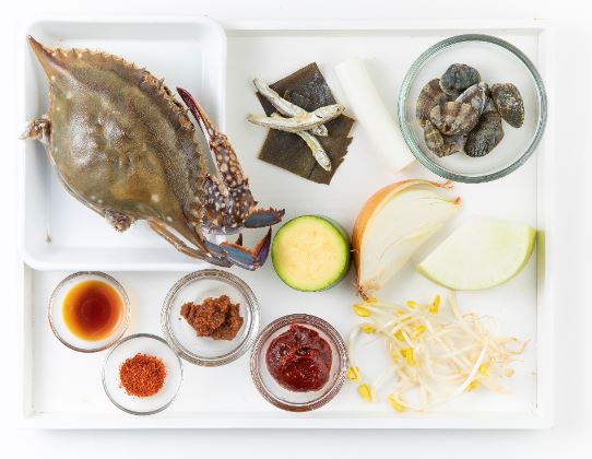 꽃게 8.2g, 바지락 4g, 조선무 11.3g, 깐양파 5g, 애호박 9.2g, 두절콩나물 5.3g, 국멸치 1.3g, 건다시마 0.3g, 깐대파 2g, 국간장 1.4g, 고춧가루 0.6g, 된장 0.5g, 고추장 0.6g, 물 300ml