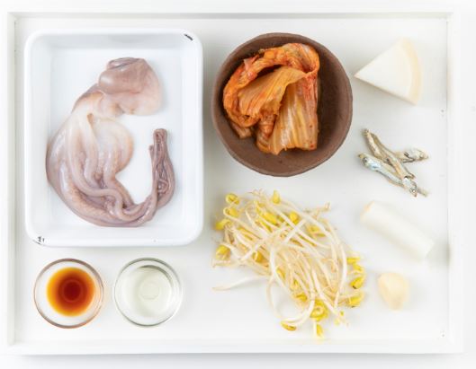 낙지 50g, 묵은지 20g, 콩나물 40g, 무 40g, 대파 5g, 마늘 5g, 국멸치 3g, 대두유 5g, 간장 1.5g, 쌀뜨물 300ml , 고춧가루 5g