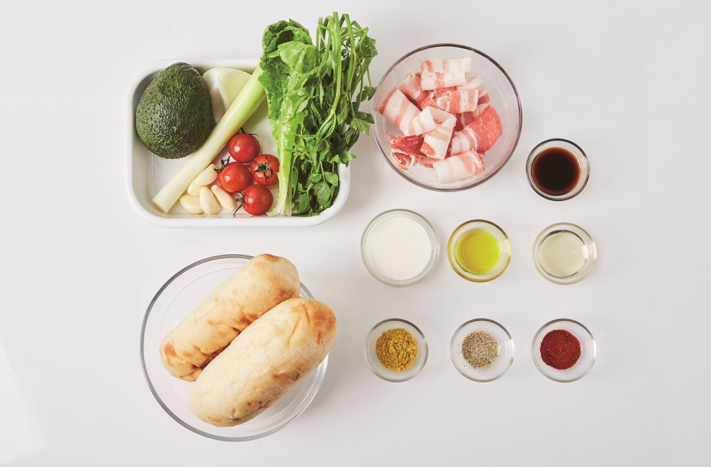 [ 2인분 ] 방울토마토(4개), 아보카도(1개), 로메인(4장), 양파(¼개), 대파(15cm), 미나리(⅓줌=50g), 마늘(5쪽), 대패삼겹살(100g), 치아바타(2개), 올리브유(0.5Ts), 후춧가루(약간), 간장(1Ts), 꿀(1Ts), 카레가루(1Ts), 고운 고춧가루(0.3Ts), 플레인 요거트(2Ts) + 꿀(1Ts)