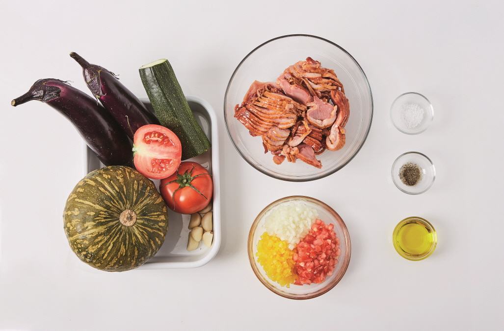 [ 2인분 ] 가지(1개), 주키니호박(½개), 토마토(1½개), 단호박(1개), 훈제 오리(400g), 마늘(6쪽), 다진 양파(½컵), 다진 토마토(1컵), 다진 파프리카(1컵), 올리브유(2Ts), 소금(0.3Ts), 후춧가루(0.3Ts)