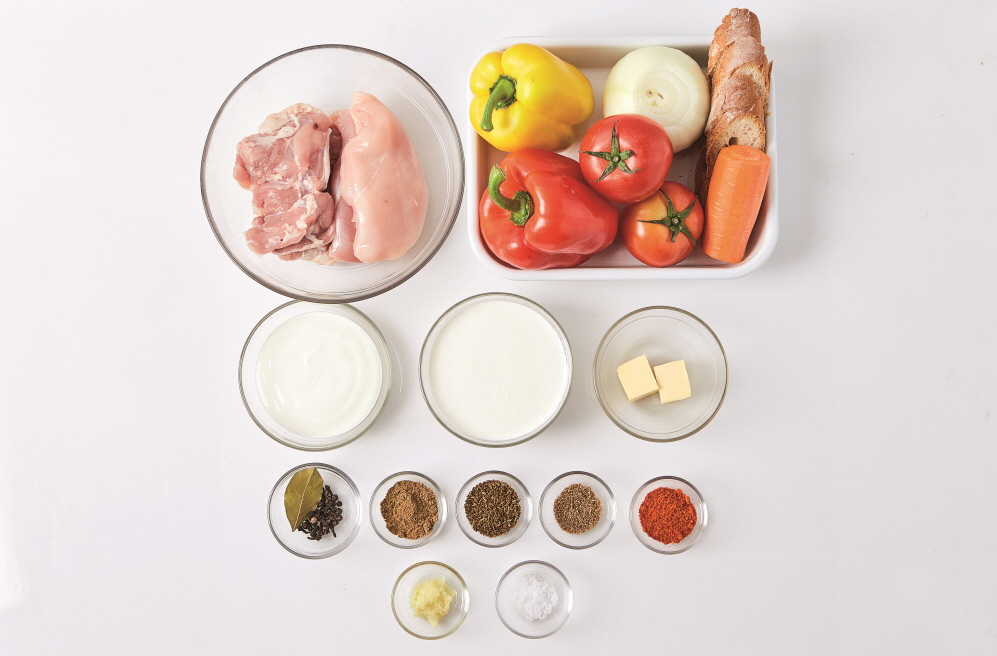 [ 2인분 ] 양파(1개), 당근(½개), 토마토(2개), 닭고기(가슴살, 다릿살 각 200g), 생크림(200g), 파프리카(빨강, 노랑 각 1개), 바게트(약간), 월계수잎(1장), 통후추(5알), 정향(1개), 요거트(1컵), 가람마살라(2Ts), 코리앤더파우더(2Ts), 커민파우더(2Ts), 다진 마늘(3Ts), 파프리카가루(2Ts), 소금(1ts), 버터(2Ts)