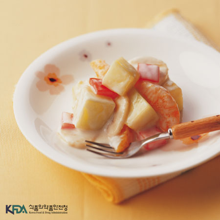 - 6. 볼에 과일을 한데 섞고 드래싱으로 버무려 완성한다.본 저작물은 '식품의약품안전처'에서 작성하여 개방한 '조리식품의 레시피 DB'을 이용하였으며,