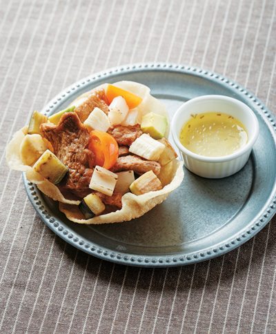 재료 콩고기(30g), 아보카도(10g), 바나나(10g), 가지(10g) 연근(10g), 방울토마토(10g), 만두피(20g) 저염간장양념 저염간장(2.5g), 물(25g), 설탕(3g) 허브오일드레싱 저염소금(1g), 식초(5g), 로즈마리(1g), 통후추(1g) 올리브유(15g), 꿀(5g)
