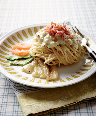 재료 바나나(150g), 아보카도(110g), 토마토(100g), 저염베이컨(46g, 3장) 바질가루(1g), 마늘(10g), 양파(20g), 휘핑크림(80g), 저염치즈(40g) 우유(200g), 소금(2g), 스파게티면(60g)