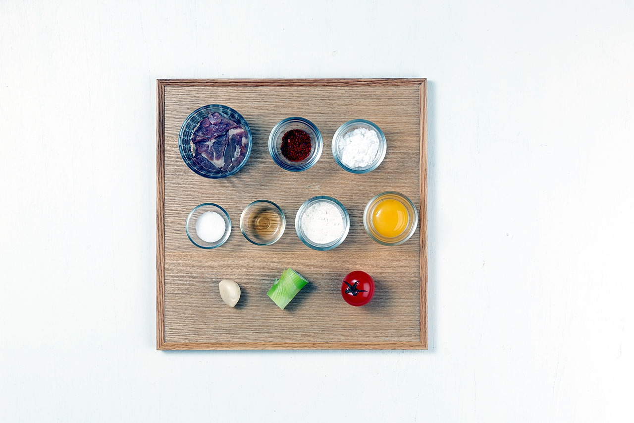소고기 70g, 대파 20g, 토마토 20g, 마늘 10g, 계란노른자 25g, 밀가루 20g, 고춧가루 15g, 식초 50g, 설탕 15g, 전분 10g